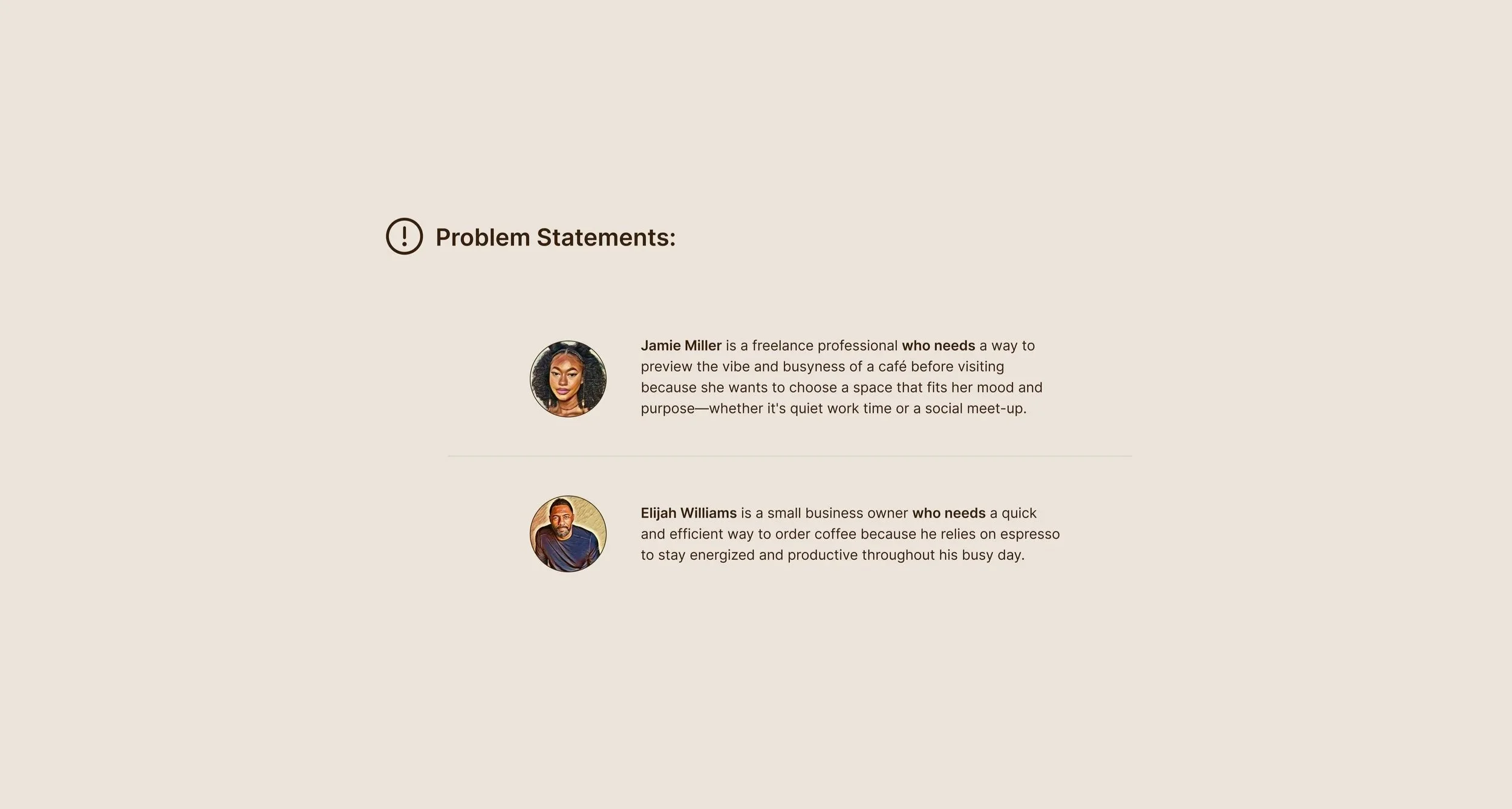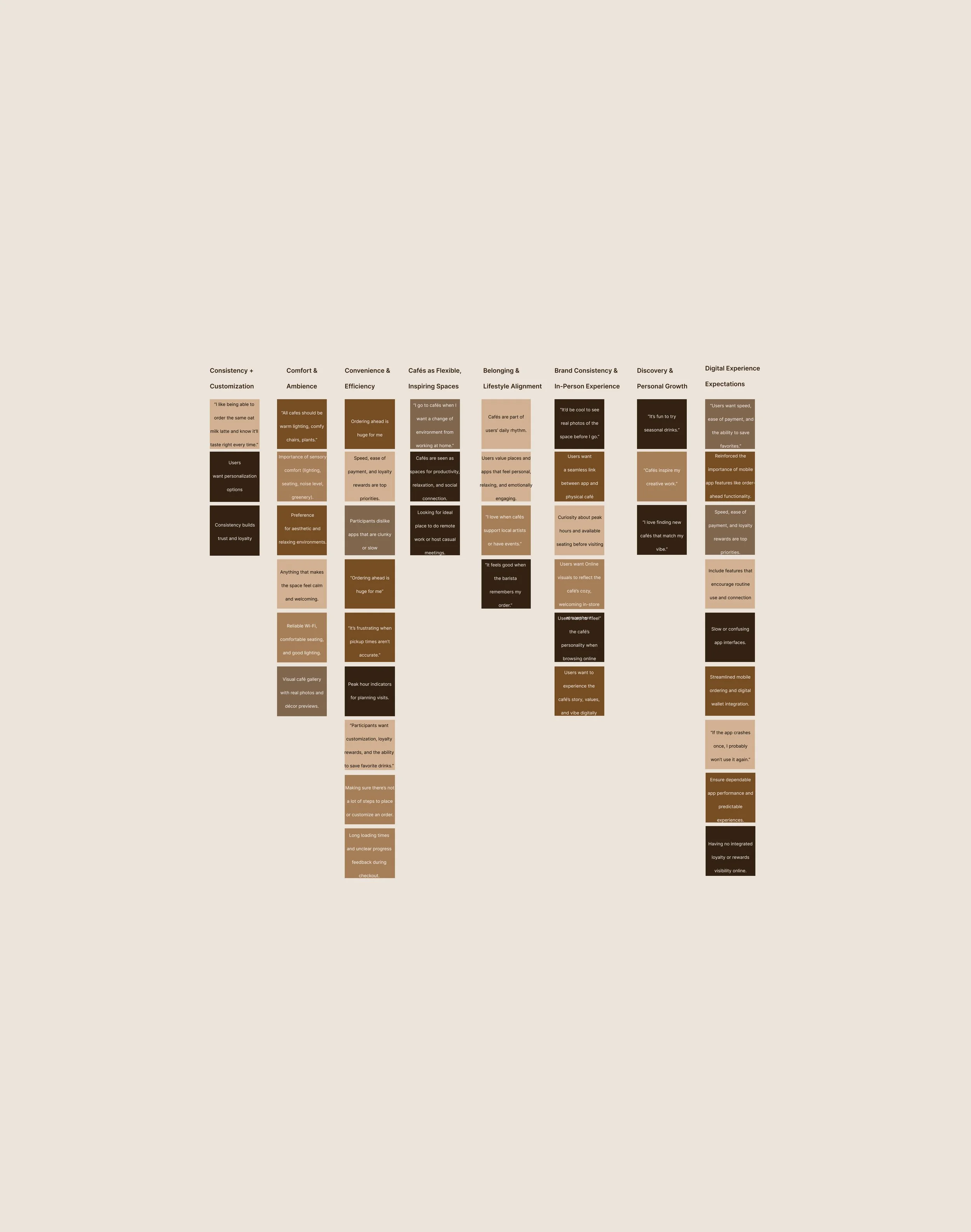 A recurring theme was the desire for a strong connection between the app and the physical space, such as previewing the café’s vibe or knowing peak hours. These insights will directly inform design choices that prioritize both practical utility and emotional engagement, helping create a café experience that aligns with users' lifestyles and expectations.