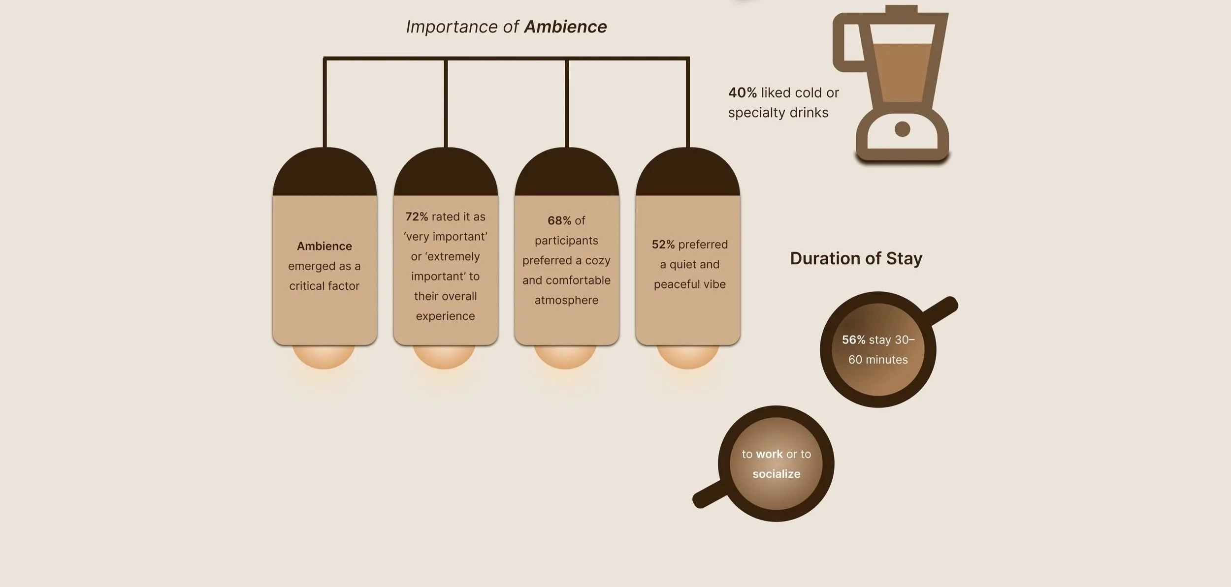 Participants emphasized that cafés serve as more than just a stop for drinks — they are valued as comfortable, flexible spaces for working, relaxing, or socializing. Ambience elements like cozy seating, lighting, and noise levels were consistently mentioned as essential to a positive in-café experience.