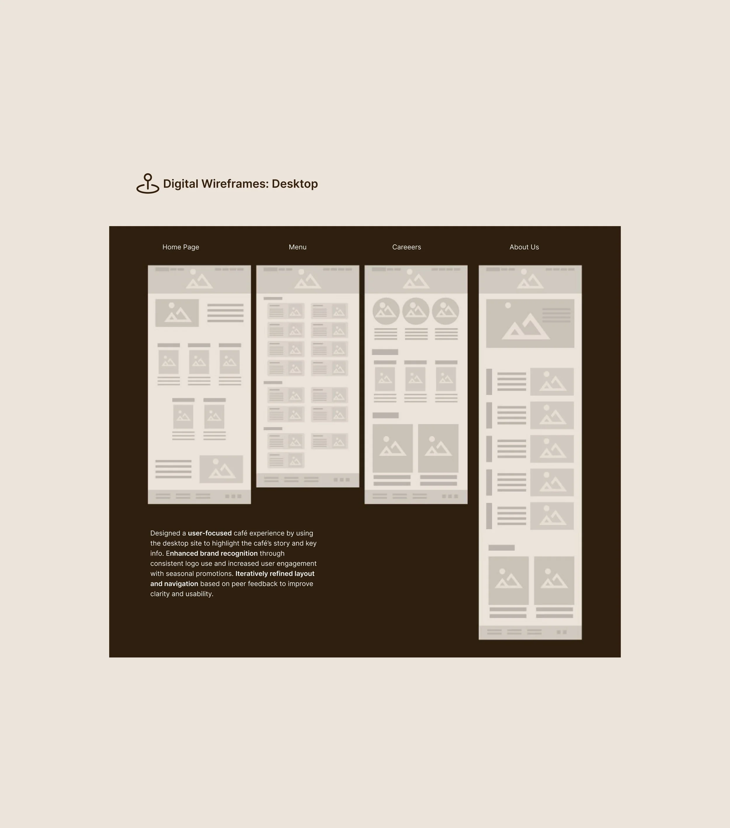 I sketched paper wireframes to establish a clear, intuitive layout that prioritized essential info like the menu and location, while subtly reflecting the café’s unique vibe and story.