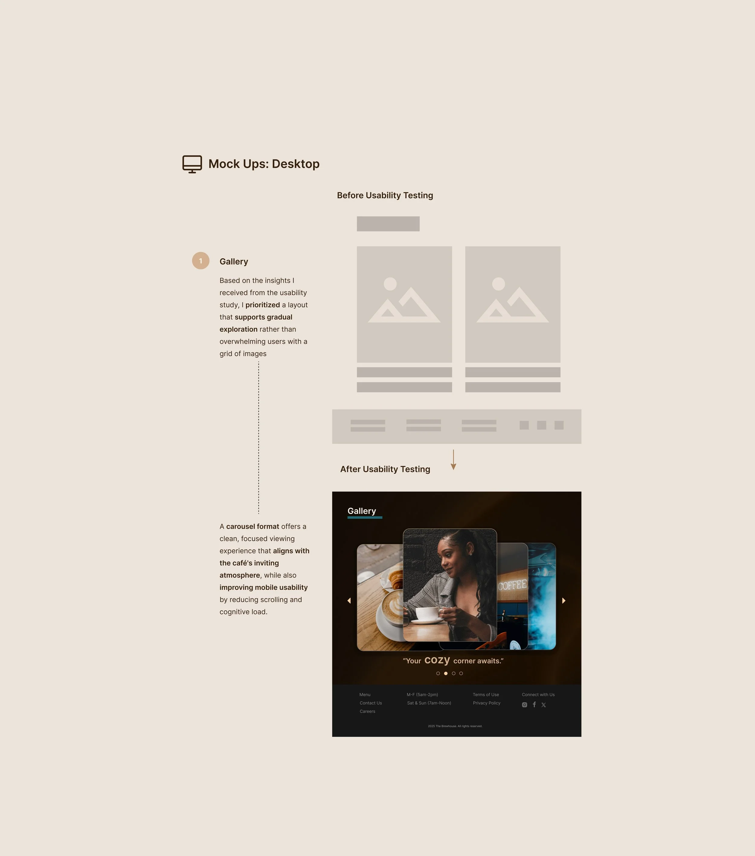 In contrast, the desktop website emphasizes storytelling and key information, offering users a richer experience of the café’s vibe, history, location, and hours. Each platform was tailored to meet user needs based on context and intent.