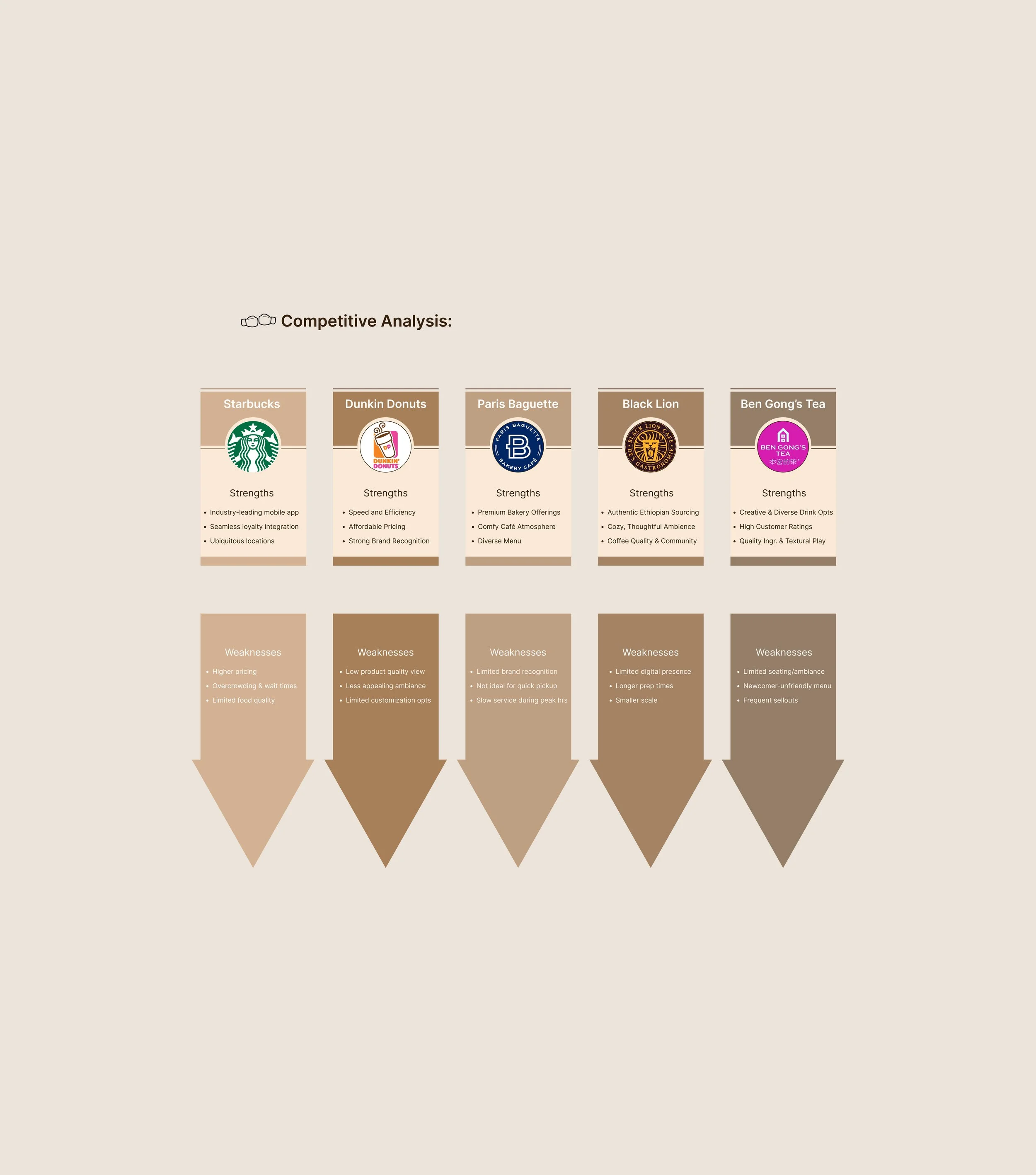 The competitive analysis explored five key players in the café industry—Starbucks, Dunkin’, Paris Baguette, Black Lion Café, and Ben Gong’s Tea—to evaluate their positioning across branding, customer experience, product offerings, and digital presence. Each brand's core strengths, weaknesses, and opportunities were identified to understand how they engage with consumers and differentiate themselves in a competitive market.