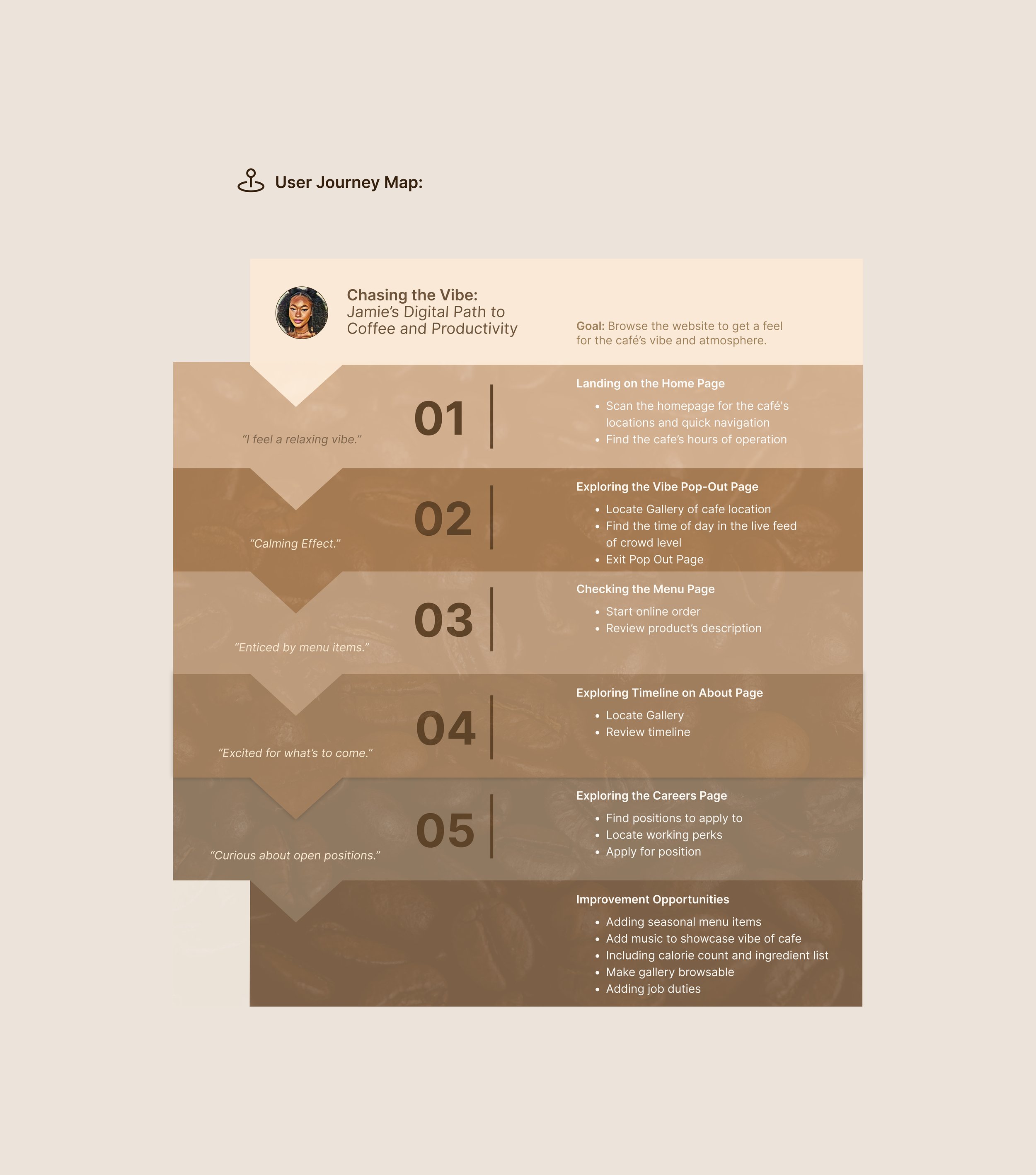 The research revealed that while drink quality is important, many customers place strong value on a café’s atmosphere, often using it as a space to relax, socialize, or work. On the digital side, participants expressed interest in features like mobile ordering, loyalty rewards, and customization, while also highlighting the need for clear product information, seasonal menu visibility, and a preview of the café’s vibe before visiting.